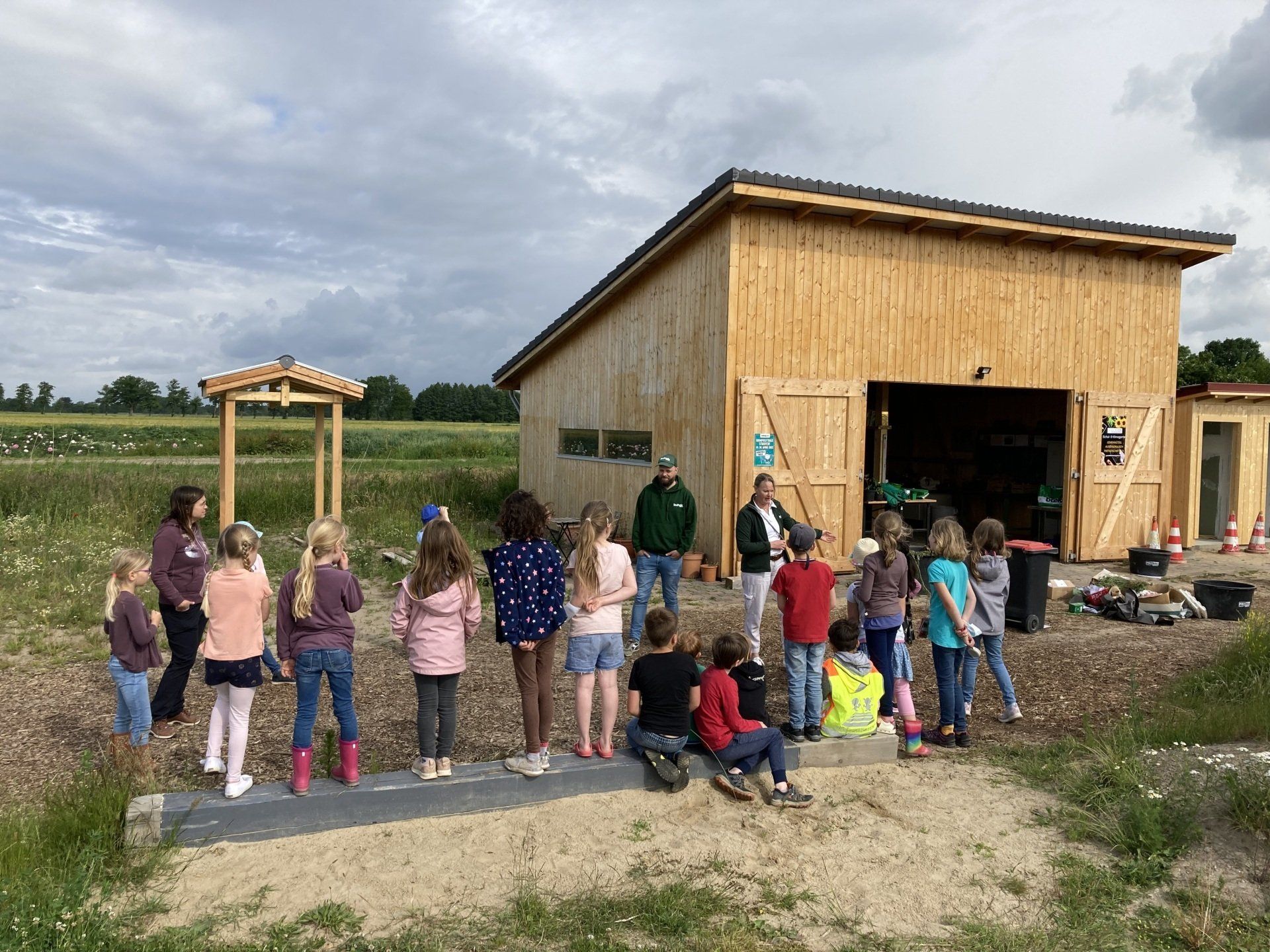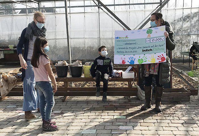 Frau Buhck machte sich selbst ein Bild vor Ort und überreichte einen gebastelten und symbolischen Scheck über die Summe der Projektförderung an die anwesende Gruppe des Jahrgangs 3 & 4 der Grundschule Curslack-Neuengamme.